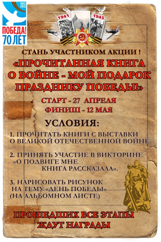Для участия необходимо прочитать книги с выставки «Я помню! Я горжусь!», ответить на вопросы викторины «О подвиге мне книга рассказала» и нарисовать рисунок о Великой Отечественной войне.