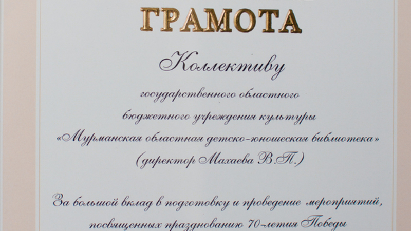 Коллектив государственного областного бюджетного учреждения культуры «Мурманская областная детско-юношеская библиотека» во главе с директором Махаевой Валентиной Павловной награждается Почетной грамотой Губернатора Мурманской области за большой вклад в подготовку и проведение мероприятий, посвященных празднованию 70-летия Победы в Великой Отечественной войне 1941-1945 годов