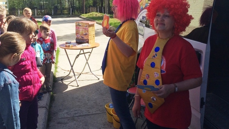 Вместе с веселыми клоунами Клепой и Кнопочкой ребята танцевали, отгадывали загадки, принимали участие в эстафете «Вытащи репку!», с удовольствием участвовали в конкурсе «Аленушка», на воздушных шариках они рисовали «лицо», завязывали платок, и шарик превращался в замечательную девочку.