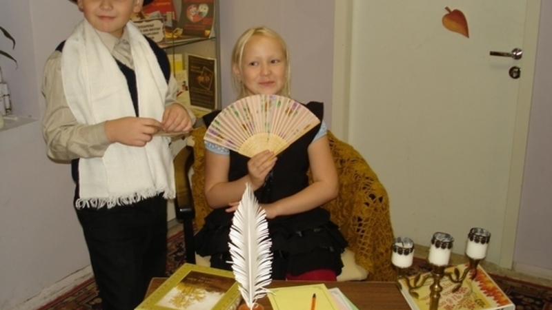 Ребята попадали в стилизованный кабинет писателя и могли перевоплотиться в образ настоящего поэта, поиграть в осенние рифмы и продекламировать стихи с импровизированной сцены.