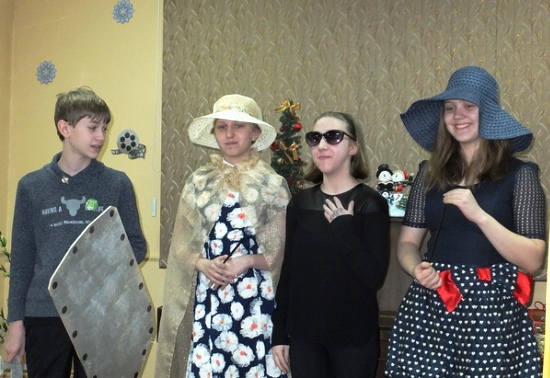 Много интересного было подготовлено для гостей на этом необычном маршруте. Обнаруженные под нарядной ёлкой волшебные бананы от Огненной Обезьяны, символа наступающего года, стали подсказками в пути. Гости отправились в путешествие по съемочным площадкам разных киностудий, где шла работа над новыми фильмами по известным литературным произведениям. За короткое время нам удалось поприсутствовать всем вместе на четырёх премьерах кинолент в разных жанрах. Актёры (учащиеся 6 «А» класса) представили приключенческий фильм с элементами триллера «Колобок», детективную историю о неуловимой банде «Гуси-лебеди»,