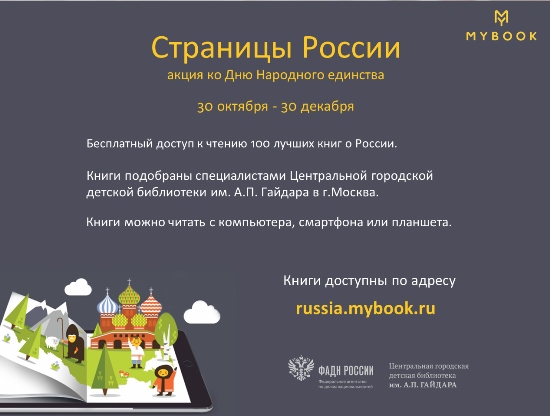 В рамках проекта «Страницы России», посвященного Дню народного единства, организован бесплатный доступ к электронной библиотеке MyBook, которая включает 100 книг, отражающих этнокультурное многообразие Российской Федерации