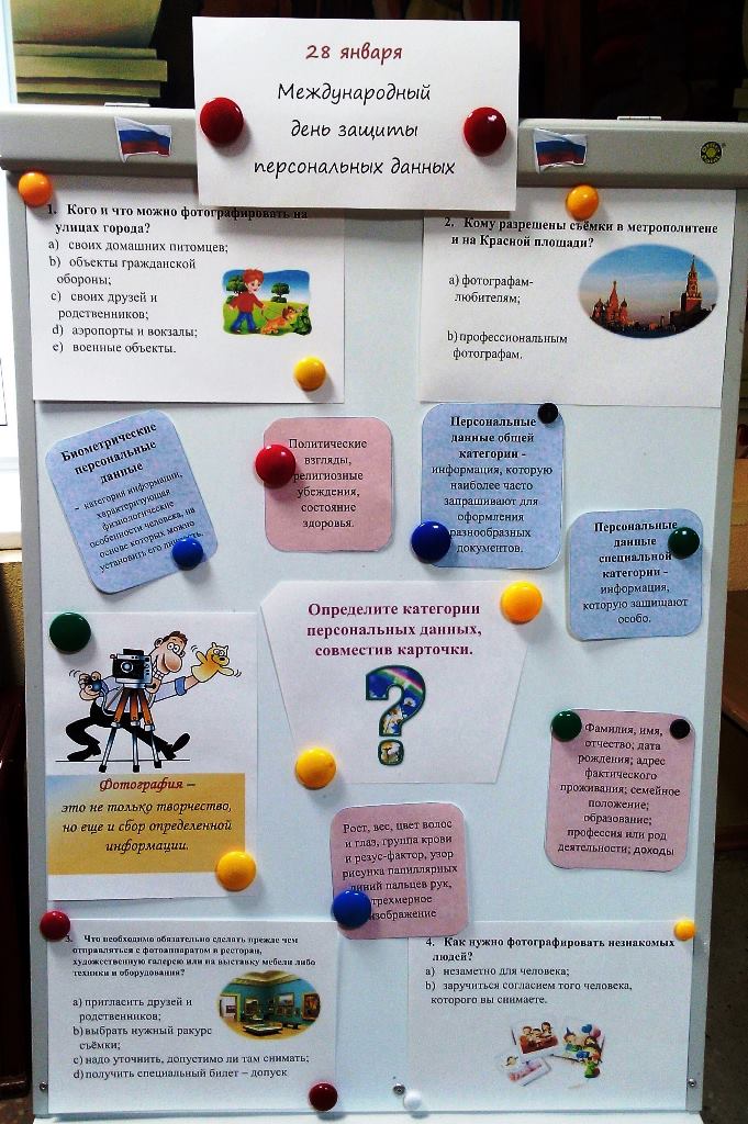 Посетители, пришедшие в этот день в библиотеку, активно знакомились с материалами выставки по теме мероприятия. Большой интерес учащихся, родителей и педагогов вызвала игра «Определи категории персональных данных» и викторины: «Безопасный интернет – детям!» и «Фотолюбитель в правовом поле».