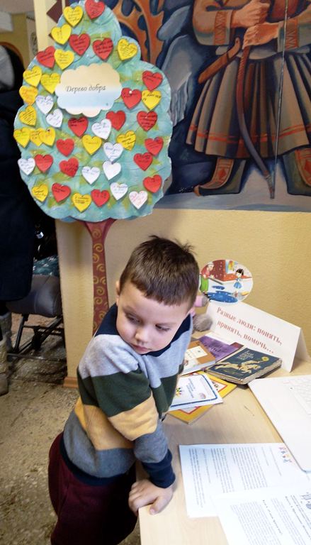 Учащиеся начальной школы активно участвовали в акции «Дерево добра». Они писали на бумажных сердечках о своих добрых делах и с увлечением смотрели мультфильмы, созданные в разных странах. Внимание участников мероприятия привлекла выставка «Разные люди: понять, принять, помочь...», на которой была представлена художественная литература, посвящённая дружбе, взаимопониманию между людьми.