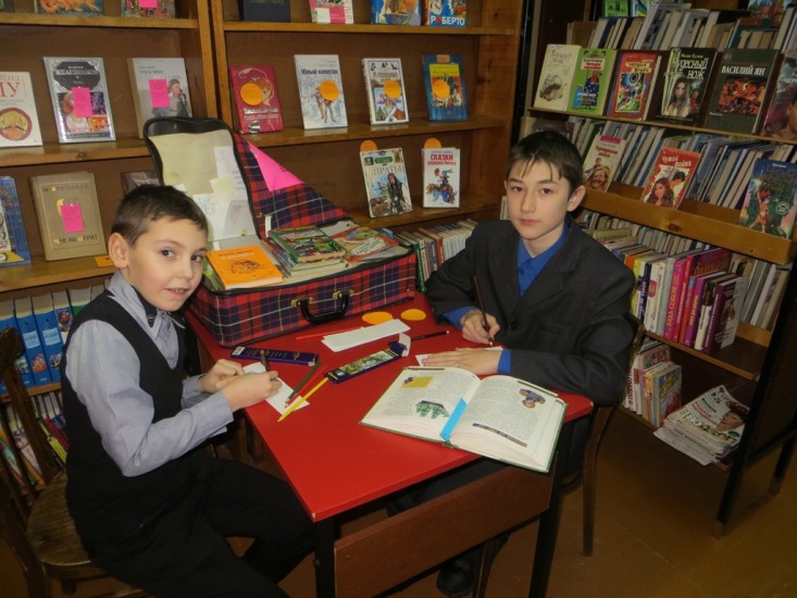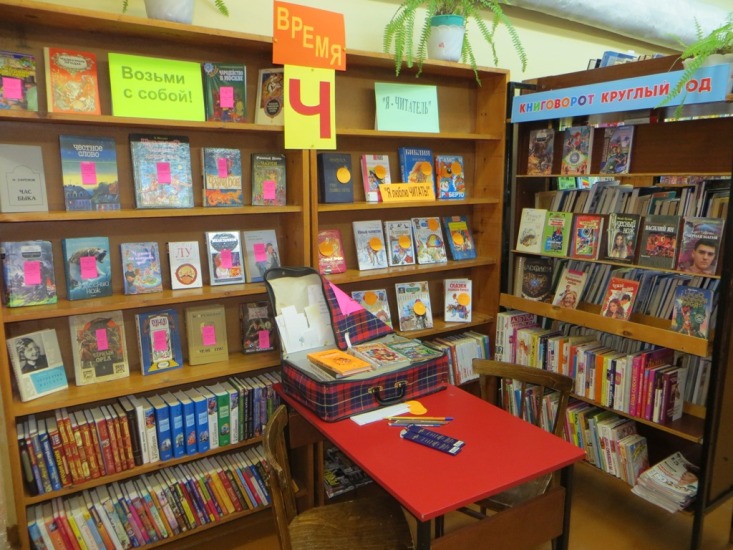 Для книголюбов среднего и старшего школьного возраста на абонементе был подготовлен Чемодан, полный самых разных историй. Ребята вслух читали истории из чемодана, искали в них слова на букву «Ч» и использовали их при создании закладки.