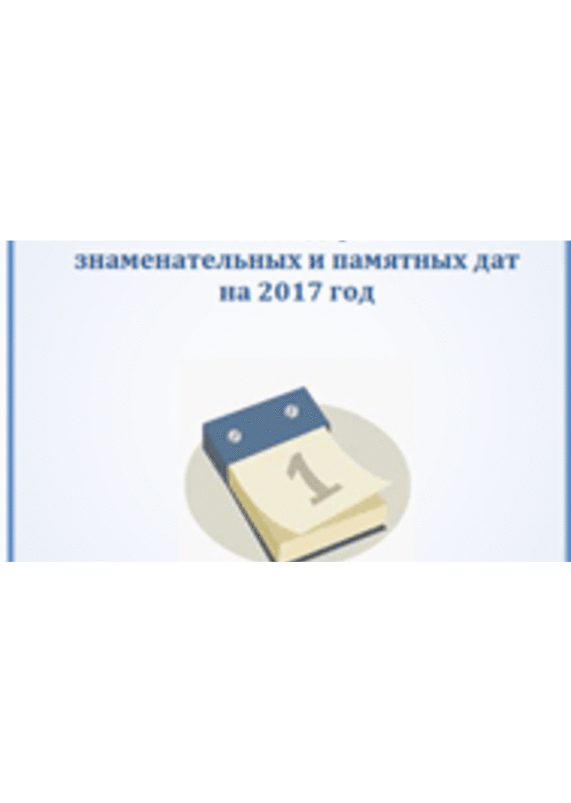 Календарь отражает информацию о знаменательных и памятных датах и включает юбилеи книг и писателей, поэтов, деятелей культуры, общественных и политических деятелей, юбилеи исторических событий и другие, общественно значимые даты, которые приходятся на 2017 год.