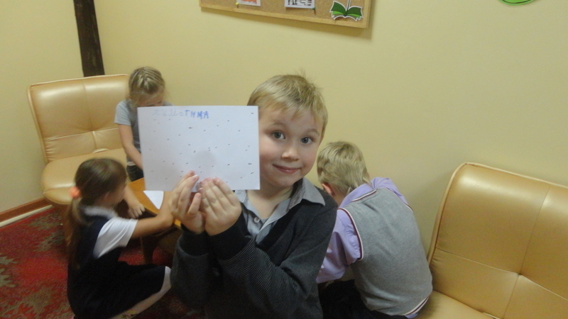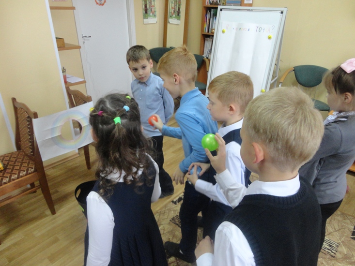 На занятии вместе с библиотекарем первоклашки придумывали, на что похожа точка, отчего может остаться след в виде точки, рассматривали разноцветные точечные узоры, играли с шариками.