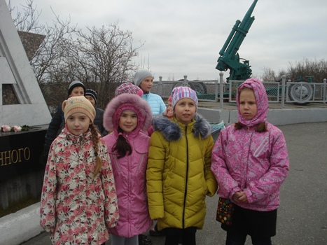 Ребята внимательно осмотрели Памятник труженикам тыла, появившийся в городе восемь лет назад и два зенитных орудия. Они узнали, что во время боевых действий на этой вершине находились зенитные батареи, прикрывавшие с воздуха город Мурманск.