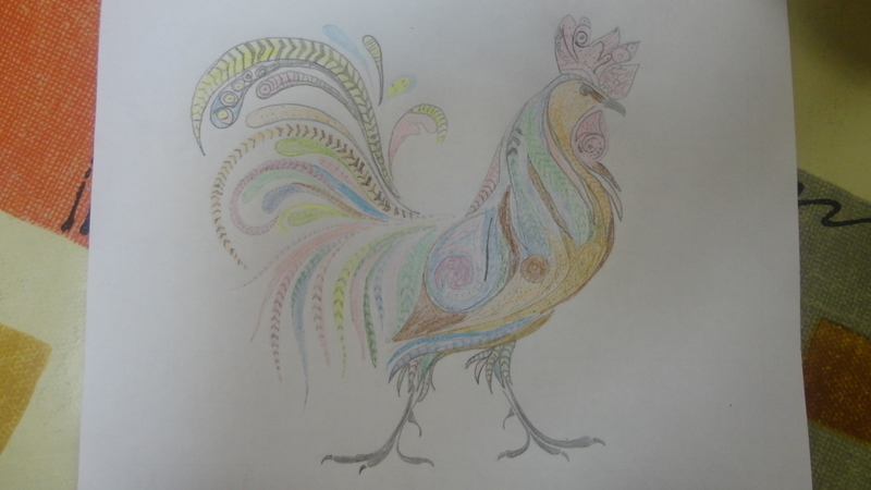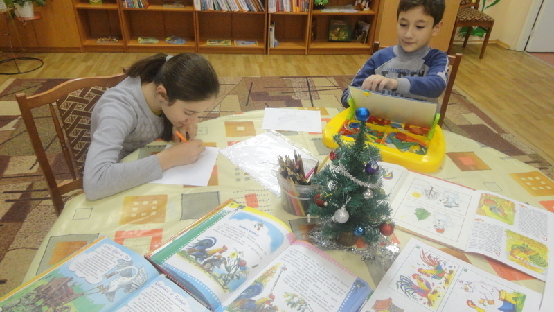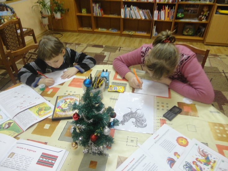 Они вспомнили все сказки, в которых главные герои петухи. Пока дети раскрашивали петуха в технике рисование для релаксации, библиотекарь читала им сказки В.Г. Сутеева «Петух и краски», «Разные колеса» и татарскую сказку «Кот, петух, гусь и бык».
