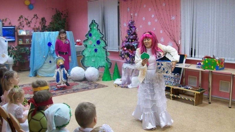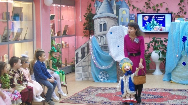 Малышей и взрослых встретила в волшебном сказочном лесу героиня русских народных сказок и мультфильмов кукла Маша, которая отправилась в лес наряжать ёлочку и искать Зимушку-Зиму.