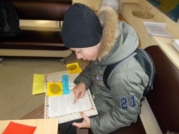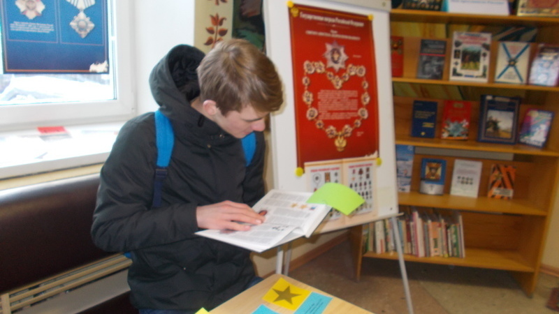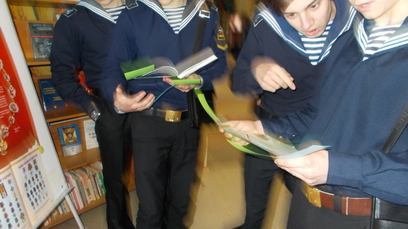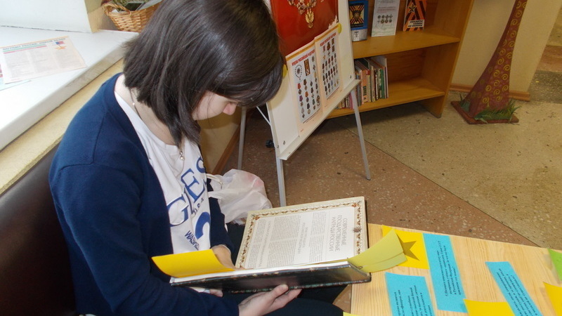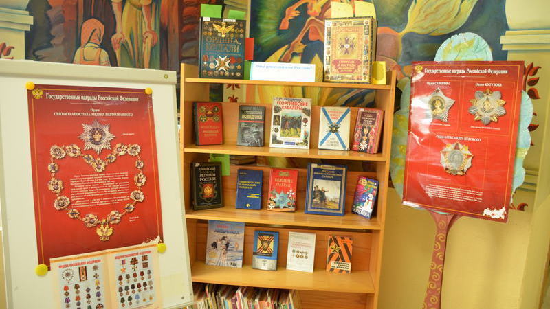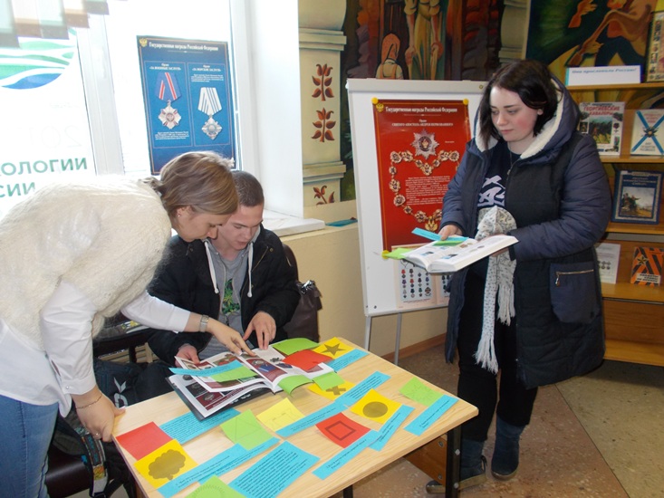 В центральном холле библиотеки была организована книжная выставка-викторина «Герои и награды России», вопросы которой при помощи цветных индикаторов были связаны с содержанием представленных на ней документов. Юные мурманчане с интересом знакомились с книгами: Игорь Гусев «Ордена, медали и наградные знаки от Петра I до современности», Юрий Лубченков «Георгиевские кавалеры». Отвечая на вопросы викторины, её участники получили возможность проверить свои знания по данной теме.