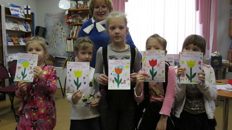 В секторе литературы на иностранных языках прошли занятия «Английского клуба для малышей». Во время занятий дети читали мамам ранее выученные стихи, пели песни, активно разучивали новое стихотворение. Так же ребята приняли участие в театрализации сказки «Репка» на английском языке. Дети вместе с родителями поиграли в подвижную английскую игру «Ник и Энди». Затем изготовили поздравительные открытки для мам: сделали аппликацию, раскрасили и подписали их на английском языке. Закончилось занятие всеобщим танцем под веселую музыку.