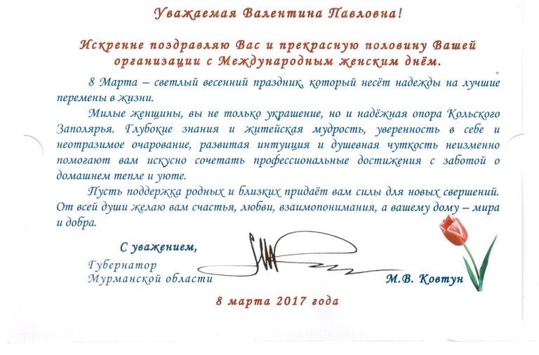 Поздравление Губернатора Мурманской области Ковтун М.В. с весенним праздником!