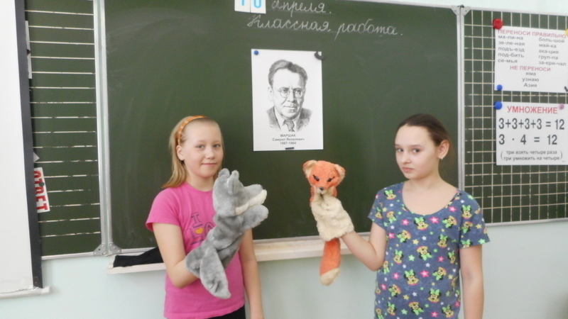 А для детей начальных классов прошёл урок «Маршак писал стихи для вас». Ребята отгадывали загадки о героях произведений. Превращаясь то в старушку, то в пуделя четвероклассники показали пантомиму «Пудель». Большую радость всем доставила инсценировка «Волк и лиса» с куклами бибабо.