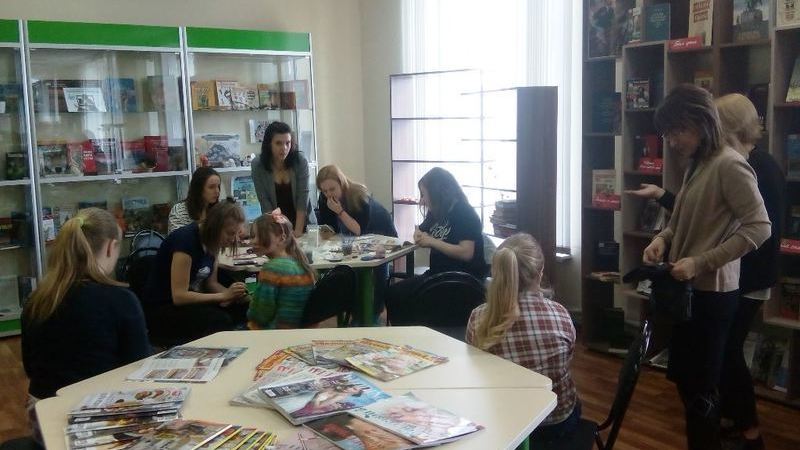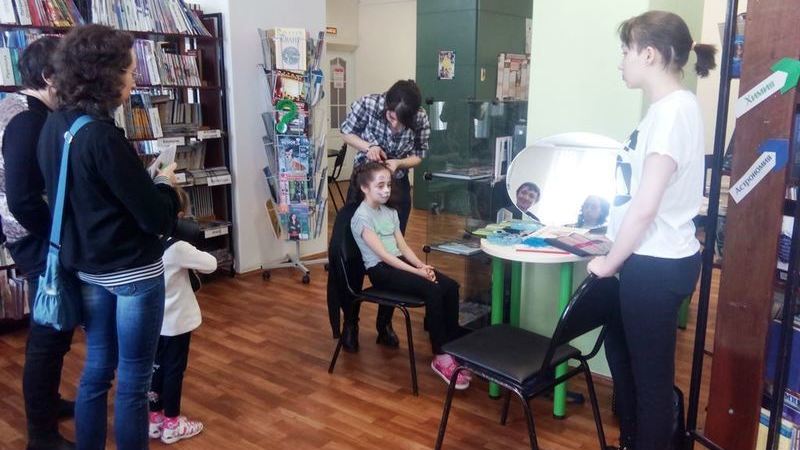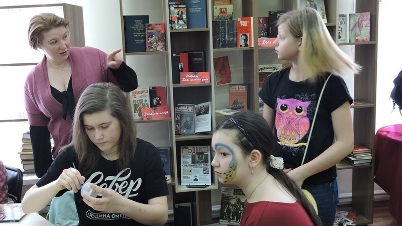 В Beauty-лаборатории каждый член читающей семьи мог выбрать себе занятие по вкусу – пока мамам и дочкам заплетали косы начинающие мастера-стилисты из Мурманского технологического колледжа сервиса, папы и сыновья могли присесть и почитать журналы и интересные научно-познавательные книги. Также любой желающий мог раскрасить себя с помощью мастеров аквагрима – на базе отдела работал мастер-класс «Сказочный аквагрим».