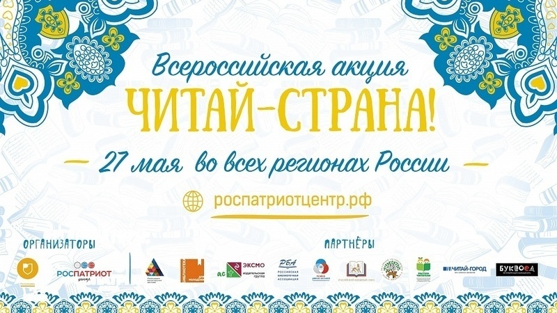 В рамках празднования Общероссийского дня библиотек 27 мая 2017 года Федеральное агентство по делам молодежи, ФГБУ "Роспатриотцентр" при поддержке Ассоциации волонтерских центров, Российского книжного союза, Российской библиотечной ассоциации, Российского движения школьников, Российской государственной детской библиотеки, Российской государственной библиотеки для молодежи, Издательской группы «ЭКСМО-АСТ», Объединенной розничной сети «Читай-город» – «Новый книжный» – «Буквоед», Ассоциации «Растим читателя» проводят Всероссийскую акцию «Читай – страна!».