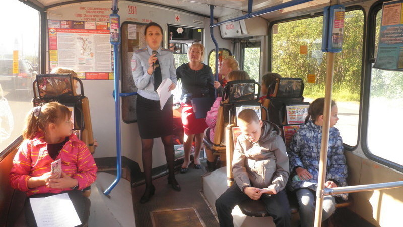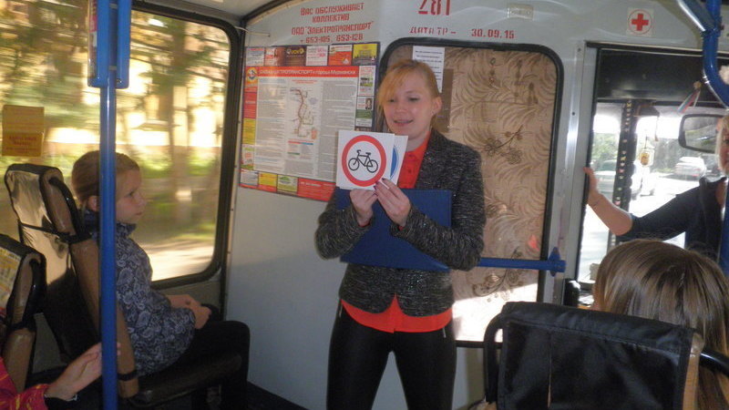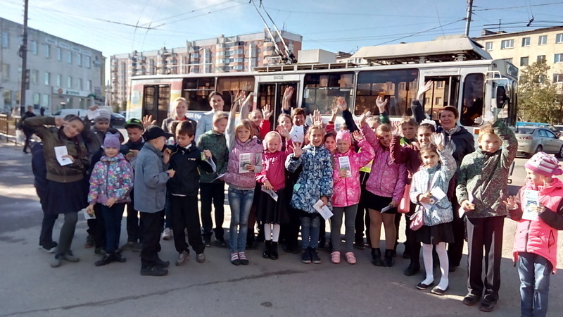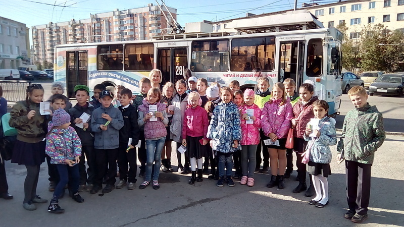 В 11 часов на именном библиотечном троллейбусе от остановки «Улица Гаджиева» по маршруту №3 ученики 4 класса мурманской школы №45 отправились путешествовать по городу.