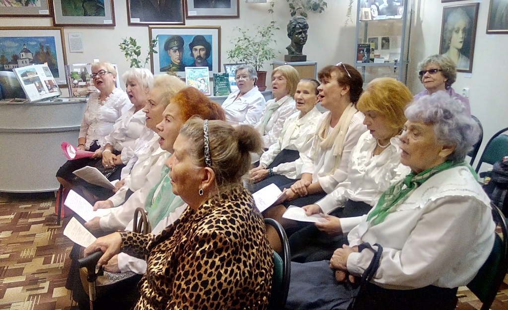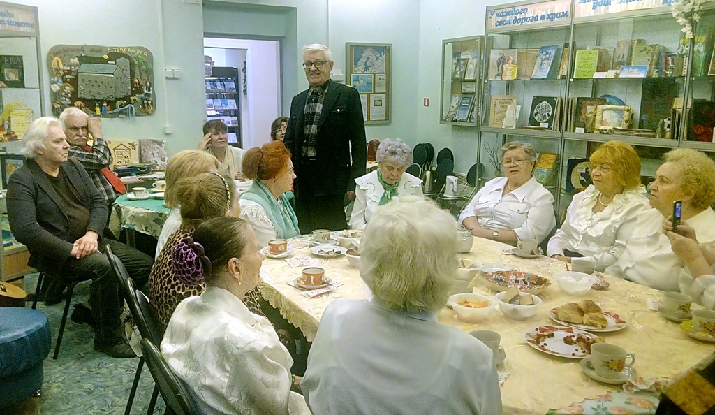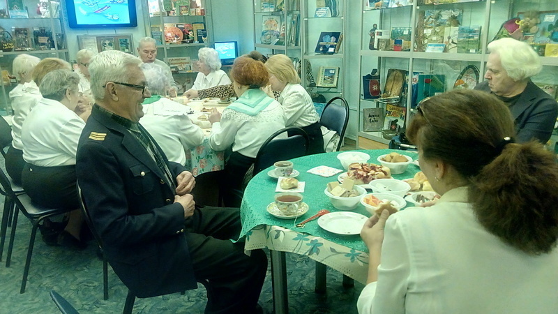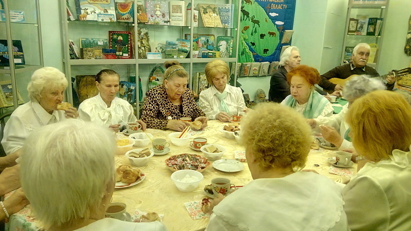 В Музее детской рукописной книги всех ждал сюрприз – пироги с яблоками и брусникой, которые испекла заведующая краеведческого отдела Коновалова Людмила Григорьевна. Пока гости пили чай с плюшками, их знакомили с детским творчеством, показывали необычные книги, рассказали, в какой технике они сделаны. Приглашенные с удовольствием продолжили пение за столом, темой их песен были город и море, война и мирное небо.