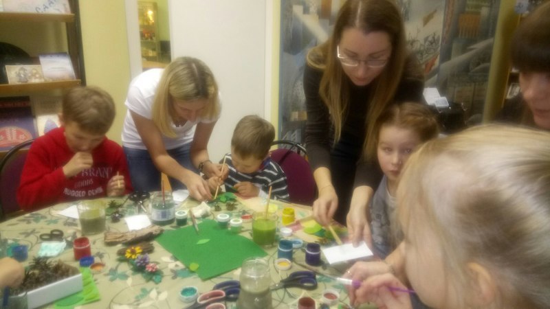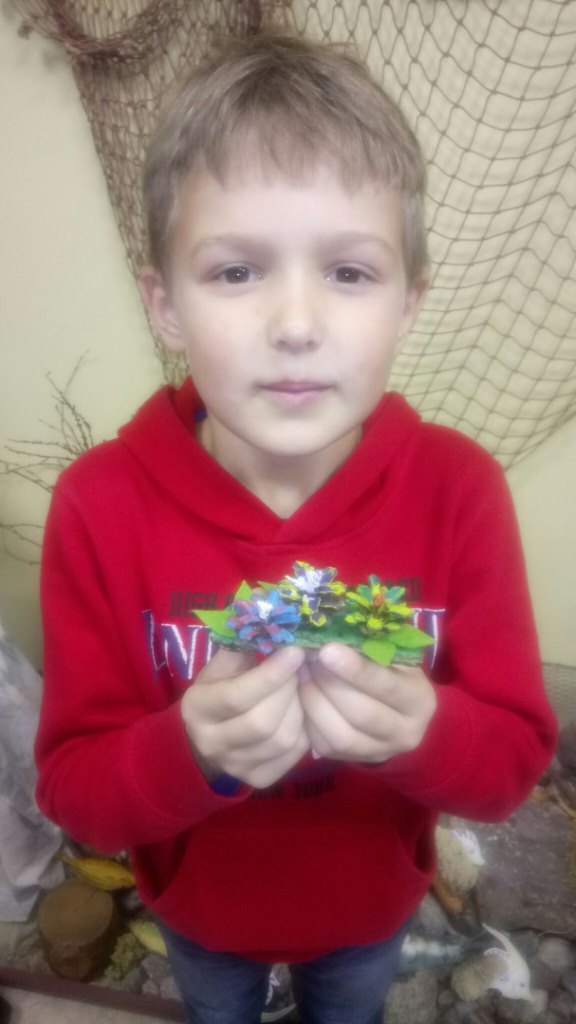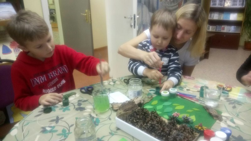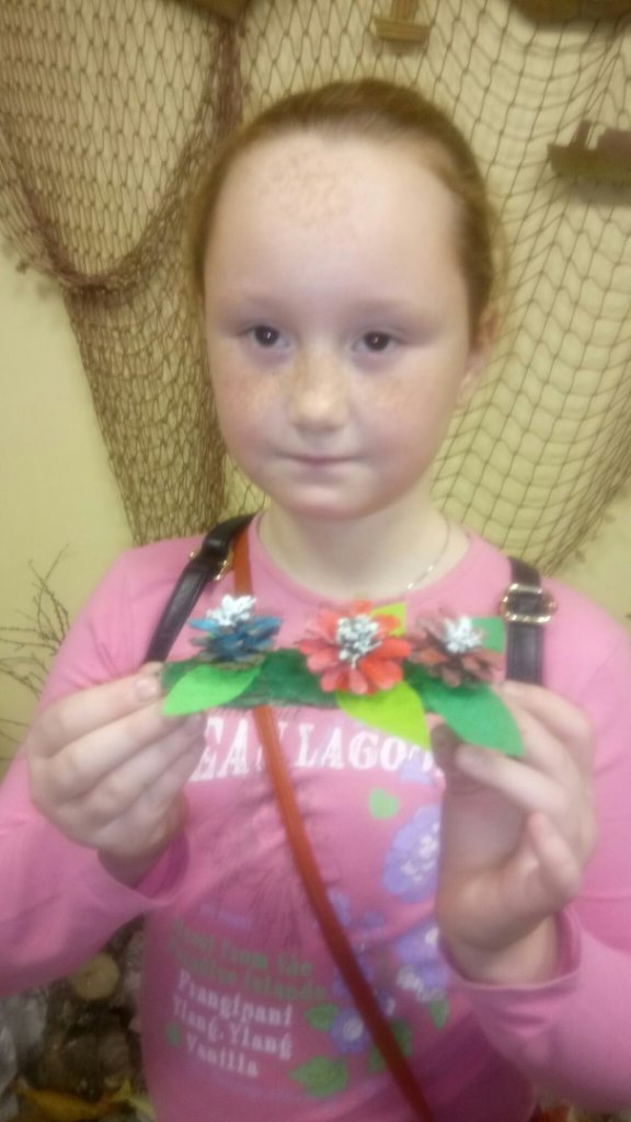 С помощью мам, бабушек и дедушек ребята ловко превращали шишки в цветы, раскрашивали их в разные цвета гуаши, украшали фетровыми листочками. Затем из получившихся букетов и небольшого куска древесины участники составляли композиции.