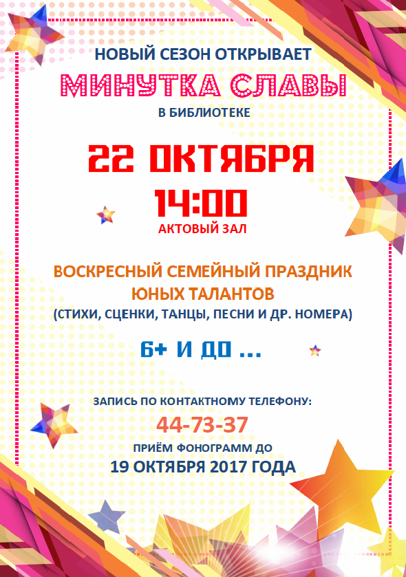 Приём заявок и фонограмм до 19 октября 2017 года в отделе искусства и творчества, запись по контактному телефону 44-73-37.