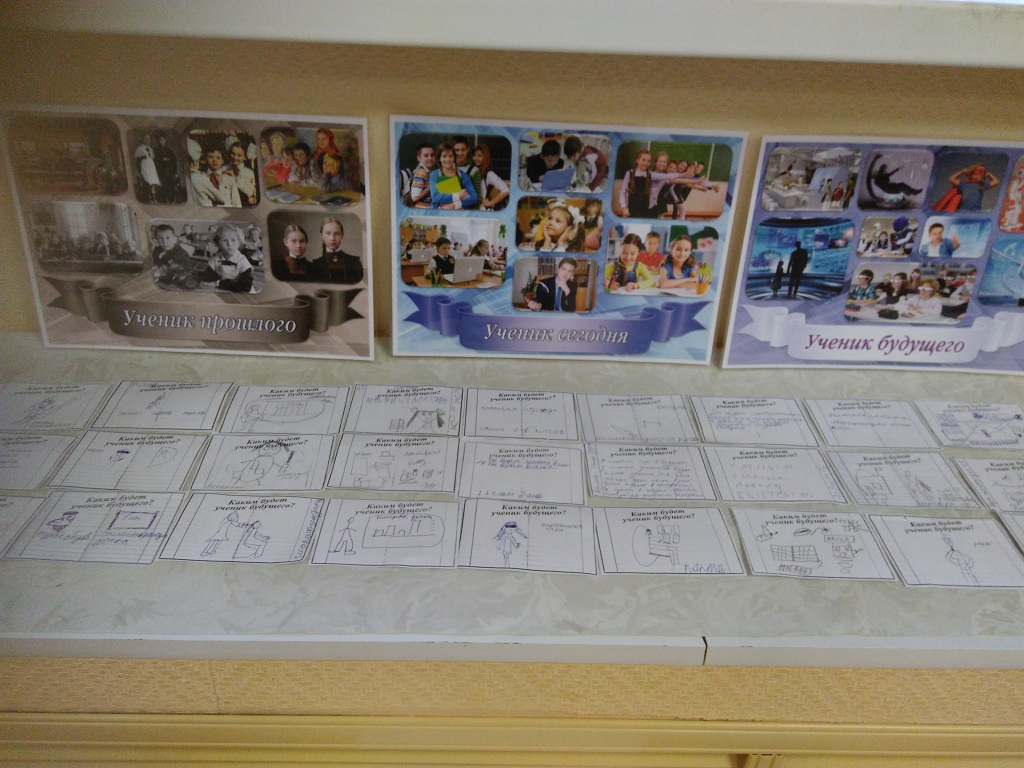 Ребята перечисляли качества личности, которыми будут обладать ученики будущего. На листочках они рисовали портрет ученика и то, что его когда-нибудь будет ожидать или окружать в самом ближайшем или далёком будущем.