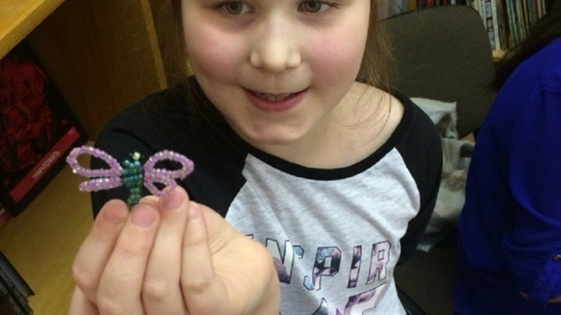 На занятии в библиотеке ребята узнали об изготовлении простых и красивых изделий из бисера и бусинок, освоили технику параллельного плетения, сделали подарки своим близким – брелок для ключей в виде стрекозы.