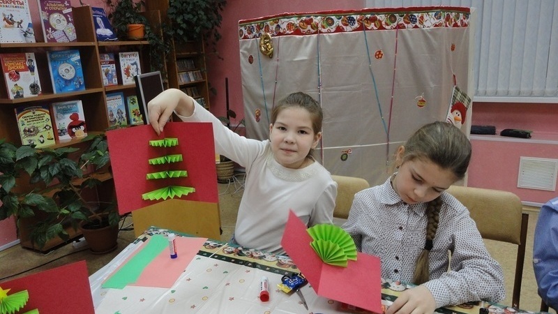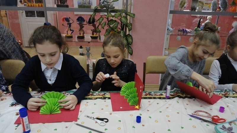 Внутренняя часть открытки представляет собой объемную елку. Лицевая сторона открытки украшена при помощи аппликации и наклеена поздравительная надпись.