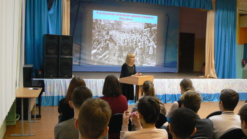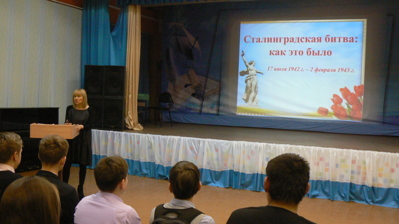 Ребята узнали, как началась Сталинградская битва, о ее этапах и о людях, которые спасли не только Сталинград, но и всю страну, весь мир от фашистских захватчиков. Библиотекарь рассказала о массовом героизме советских солдат и офицеров, о морском пехотинце Михаиле Паникахи, о доме Павлова, о Мамаевом кургане.