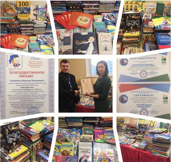 Еще одним заинтересованным партнером акции «Дарите книги с любовью» стал торговый комплекс «Лента» (г. Мурманск). Руководство гипермаркета, в лице директора Н. Иванченко, активно поддержали предложение областной детско-юношеской библиотеки. В магазине были размещены баннеры и афиши, по громкой связи звучали объявления. В течение двух недель шел сбор книг. Итог впечатляющий: сотрудники и покупатели передали в дар 732 издания.