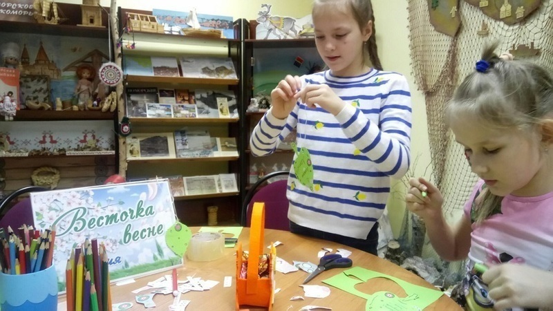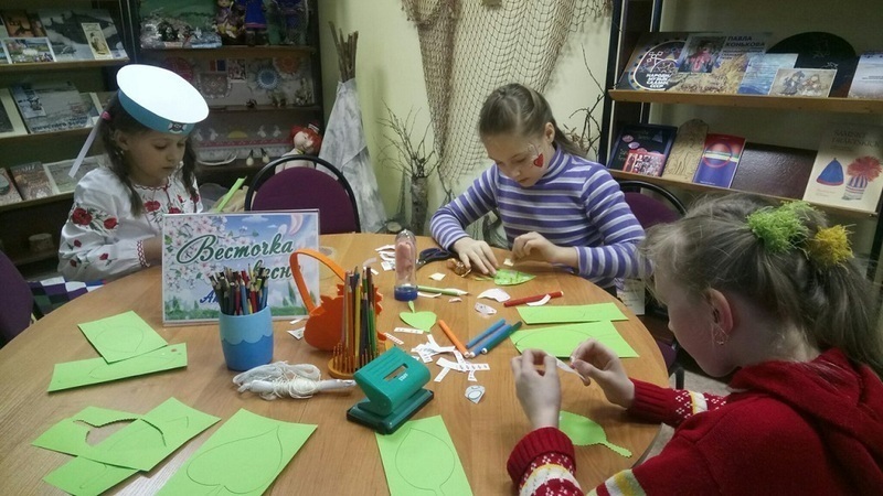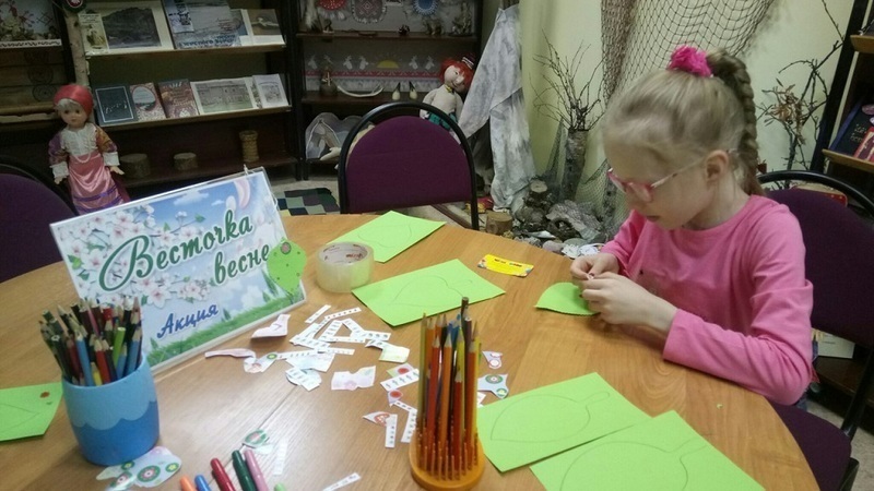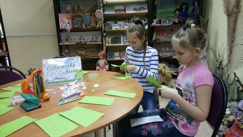 Ребята вырезали из цветной бумаги ажурные листочки, украшали их наклейками в виде бабочек и тюльпанов , писали на листочке послания весне, призывая её поскорее посетить наш Северный край! Участники акции выбрали на аллее около библиотеки самую симпатичную березку, украсили её самодельными листочками и прокричали весне задорную закличку.