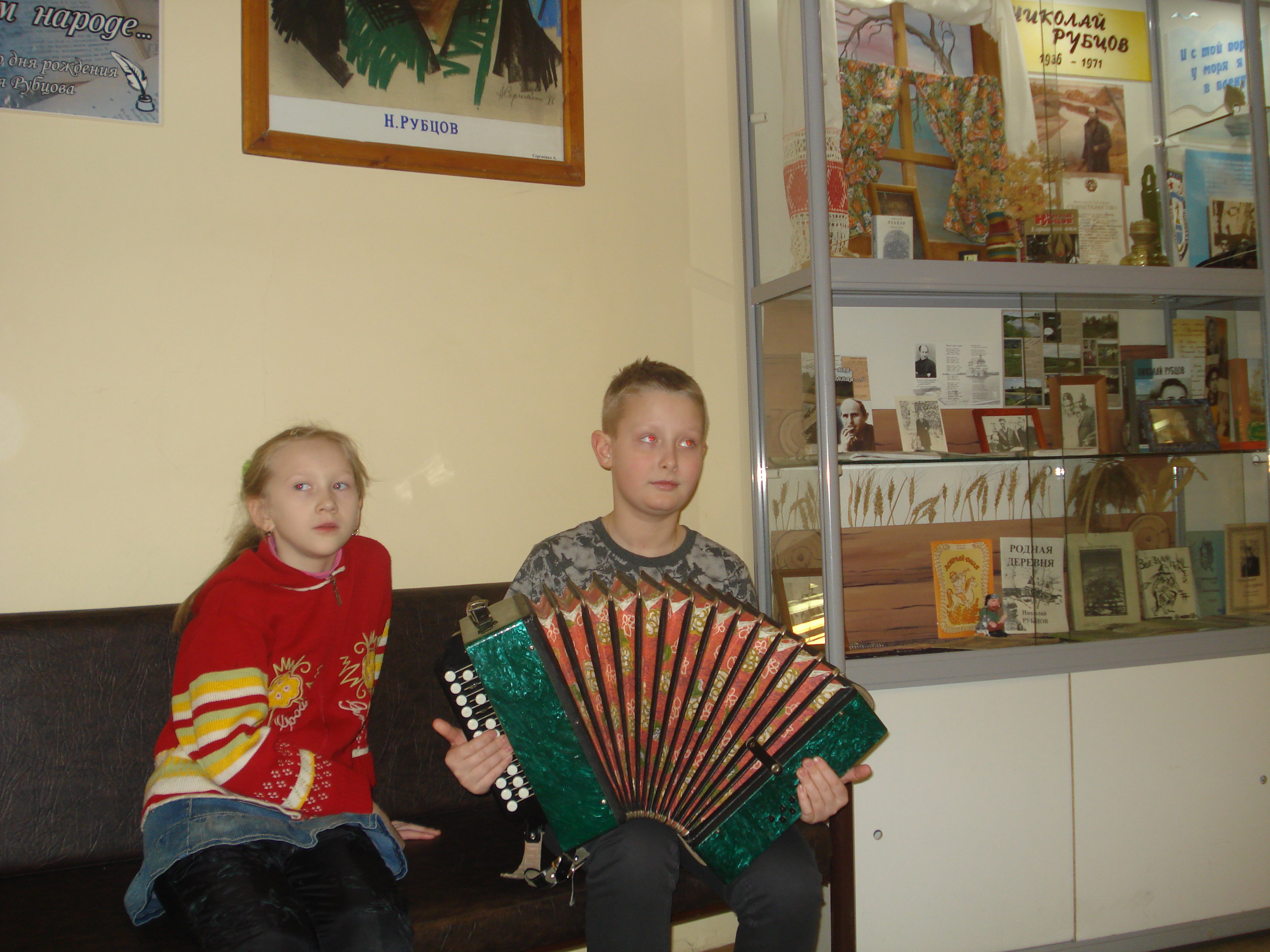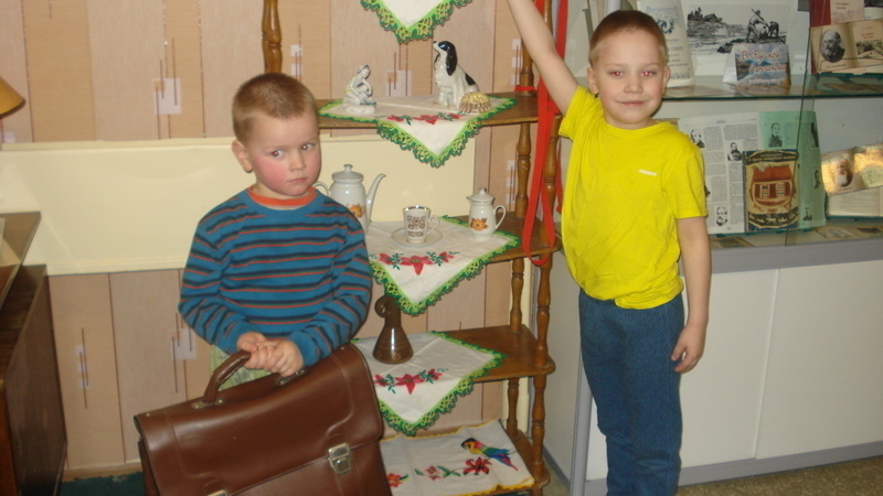 Маленькие посетители с удовольствием разглядывали экспонаты музея, заглядывали в писательский портфель для рукописей и даже поиграли на гармошке, на которой, возможно, много лет назад играл сам поэт Николай Рубцов.