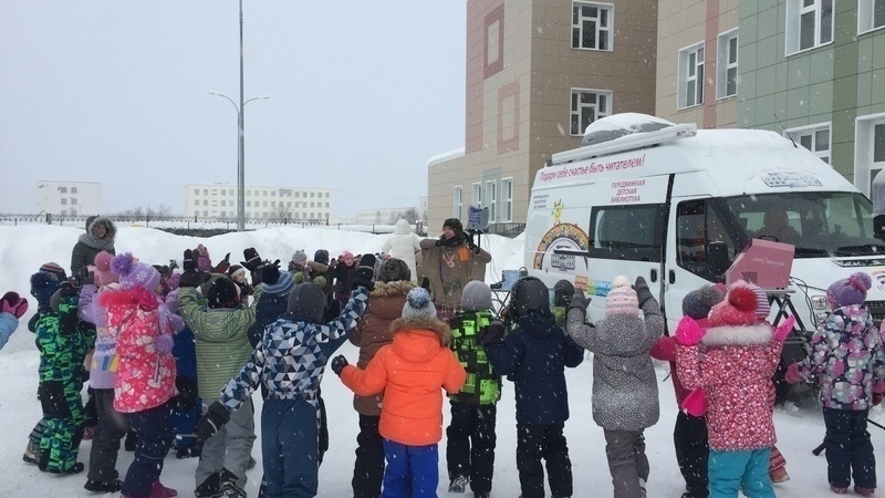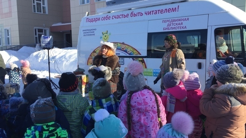Презентация передвижной детской библиотеки и областной детско-юношеской библиотеки прошла во дворе детского сада. Лиса Алиса и Баба-яга не дали малышам скучать и мерзнуть. Они устроили соревнования между командами мальчишек и девчонок на скорость в «полете на метле», на реактивность воздушных шариков, на точность в отгадывании загадок.