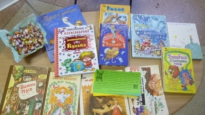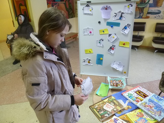 Юных читателей увлекли занимательные библиографические игры. Так, с помощью цитат, иллюстраций, размещенных на стенде, они узнавали названия, авторов, литературных героев знакомых книг. Те, кто узнал три и более книги получали сладкие призы.