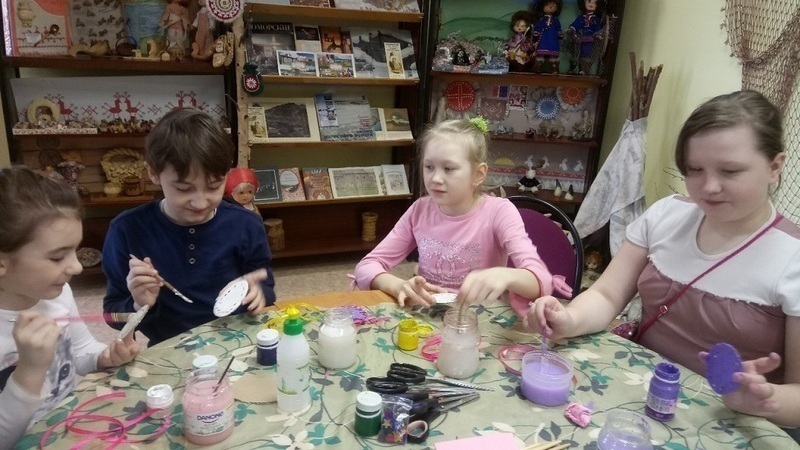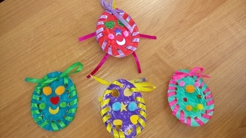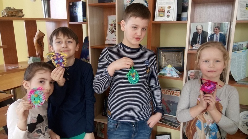 На мастерской ребята, вдохновившись пасхальными традициями, учились делать декоративные яйца. Для этого им понадобились картонные заготовки яиц, на которых при помощи дырокола были сделаны петельки. Ребята красили картонные яйца акриловыми красками и гуашью ярких цветов, продевали, заранее подготовленные петли, атласные ленты украшали поделку бисером, пайетками, декоративной тесьмой и помпонами. В итоге получились яркие пасхальные яйца, которые можно преподнести в качестве подарка своим родным и близким.