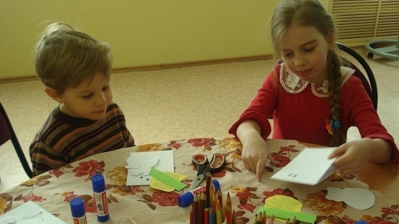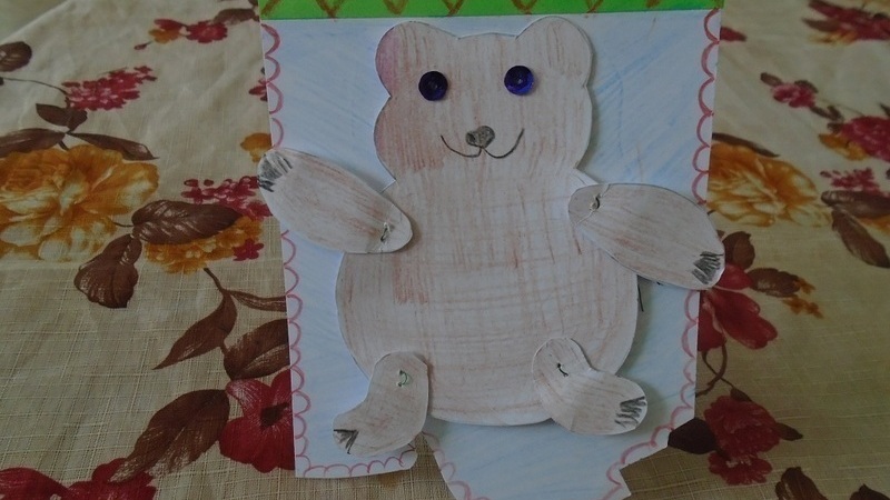На обложке ребята разместили медвежонка, которого вырезали из плотного белого картона. К туловищу медведя дети прикрепили верхние и нижние лапки медной проволокой, чтобы лапки животного могли свободно двигаться. Глазки мишки ребята украсили пайетками, а нос и коготки нарисовали карандашами. Странички книжки мастерята оформили заготовками стихотворения о медведе и своими небольшими историями о «Потапыче», а также разместили красочные рисунки весёлых медвежат.