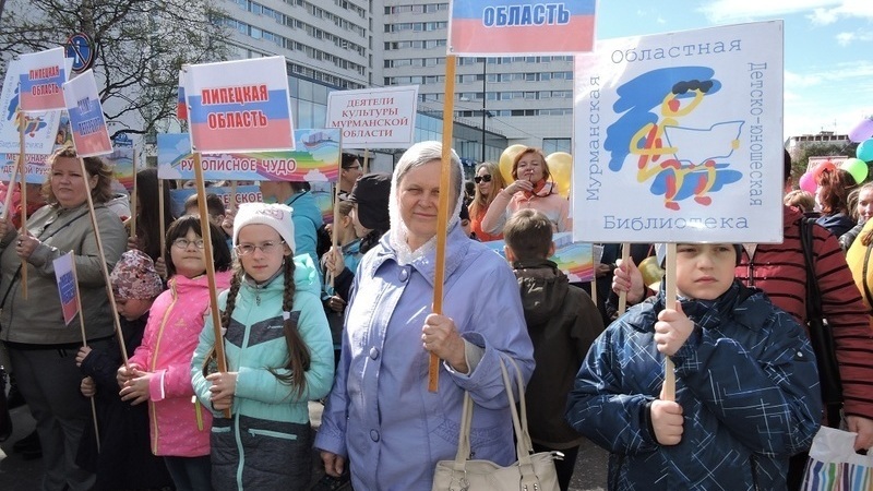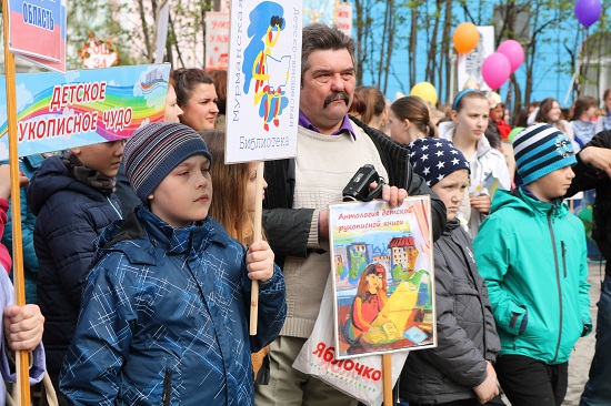 Дети несли в руках эмблемы Международного конкурса детской рукописной книги, которому исполнился 21 год, логотип Мурманской областной детско-юношеской библиотеки как основного организатора проекта, флажки территорий Российской Федерации – участниц конкурса, растяжки «Детское рукописное чудо», транспаранты «Антология детской рукописной книги».