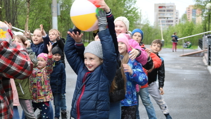 На большом воздушном шаре ребята совершили увлекательное путешествие в прекрасную страну детства. Но сначала нужно было всем как следует познакомиться и подружиться. В этом девчонкам и мальчишкам помогла игра «Здесь сегодня все друзья!».
