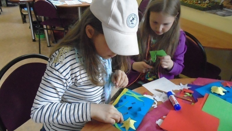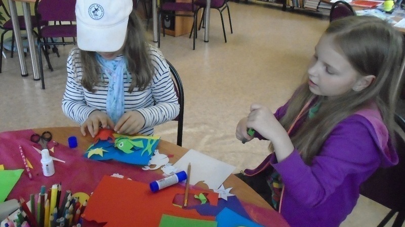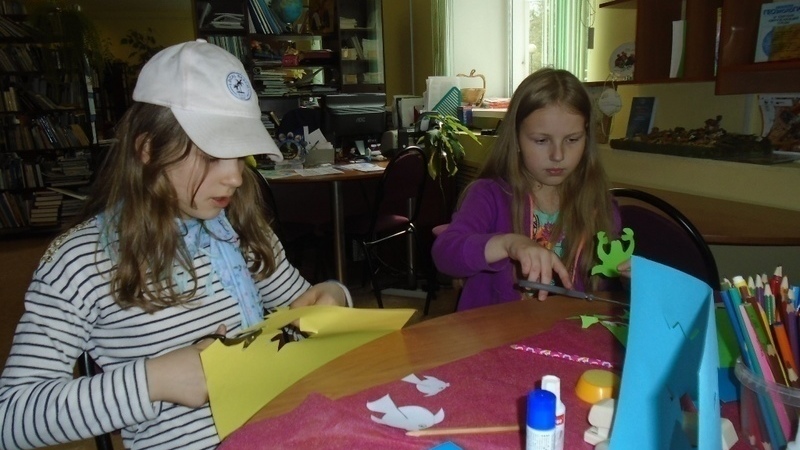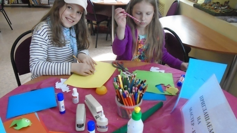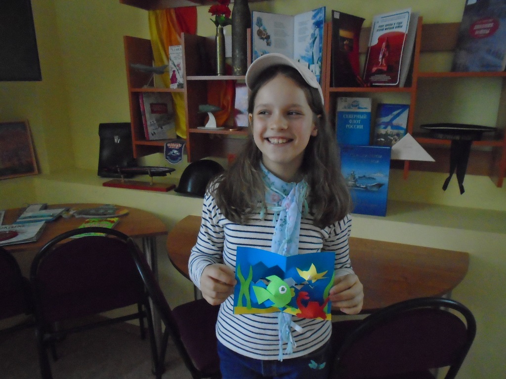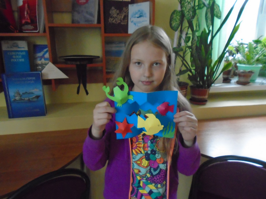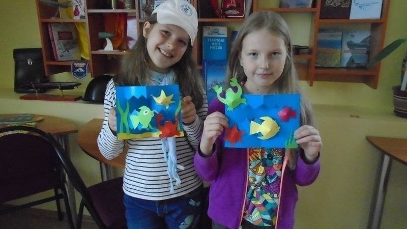 Море и волны девочки сделали из синего плотного картона, а рыбок, крабов и морских звёзд вырезали из разноцветной бумаги. Глазки морским обитателям украсили блестящими пайетками, а плавники и чешую рыбкам раскрасили карандашами. Всех морских животных школьницы разместили на бумажных волнах и украсили волнистыми зелёными водорослями.