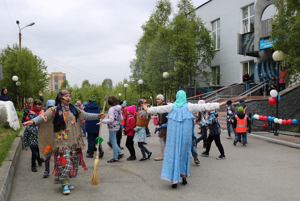 Здесь они встретились с фольклорными героями Алёнушкой и Бабой-ягой в исполнении сотрудников библиотеки.