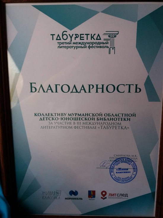 Коллективу Мурманской областной детско-юношеской библиотеки за участие в III международном литературном фестивале «Табуретка» была вручена благодарность.