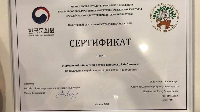 Состоялось вручение сертификатов на получение корейских книг для детей и юношества в четыре библиотеки России: Архангельск, Рязань, Челябинск и Мурманск!!!