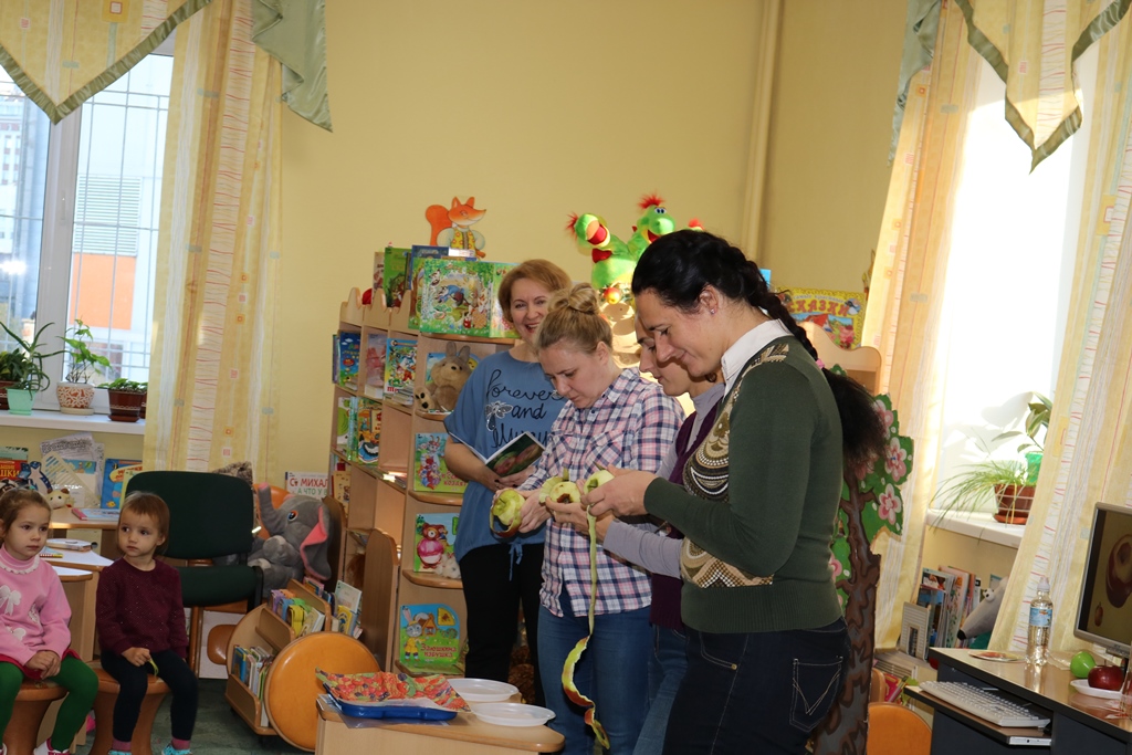 мамы чистили яблоки для шарлотки, соревнуясь, у кого получится самая длинная лента из яблочной кожуры;