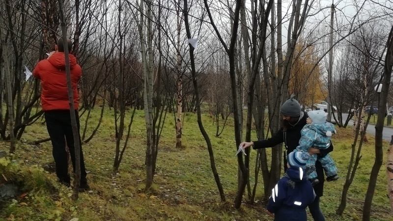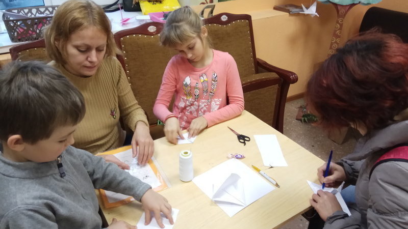 Сотрудники МК «Отличная идея» провели мастер-классы по изготовлению птиц в технике оригами. Участники акции, смастерившие журавликов, развесили их на деревьях в сквере перед библиотекой, проголосовав тем самым за мир.