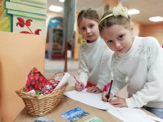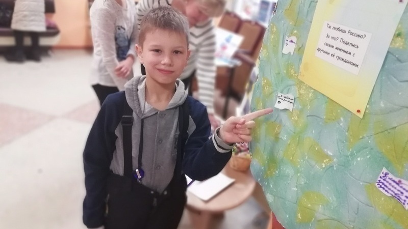 Всем посетителям было предложено ответить на вопрос: «За что я люблю Россию?». Они писали ответы на специальных карточках в форме флажков, где сообщали о том, что Россия – это наша Родина, что в ней много красивых мест и добрых людей, что это миролюбивая страна.