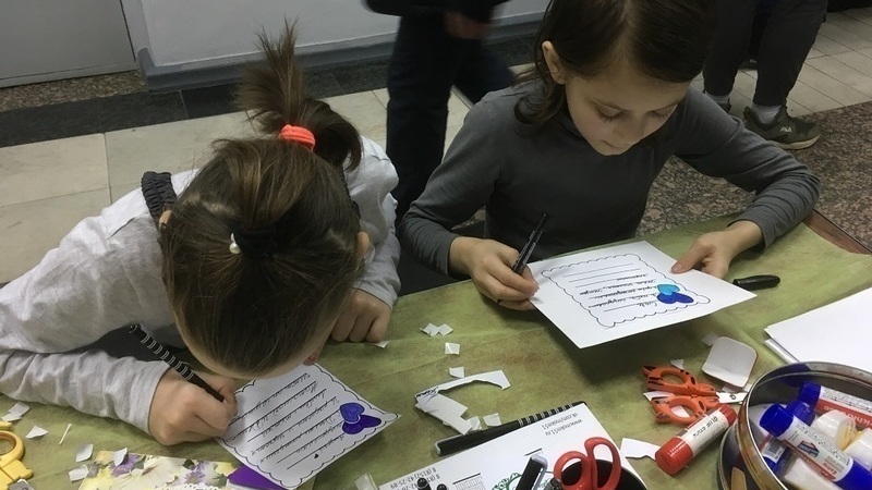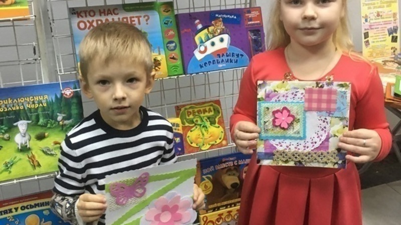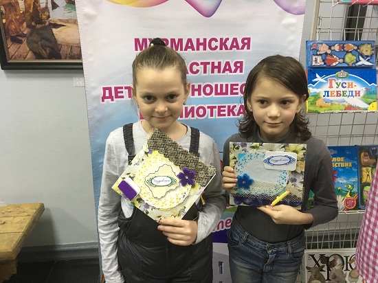 На занятии ребята самых разных возрастных групп сделали поздравительную открытку любимой библиотеке, используя разные виды творчества. Маленьким мурманчанам было предложено поздравить библиотеку открыткой, сделанной в технике скрапбукинг.