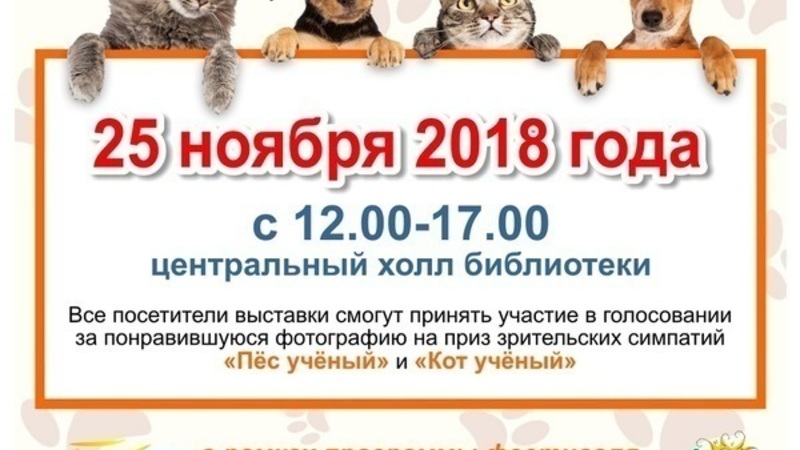 На первом этаже в центральном холле будет организована благотворительная фотовыставка «Книга, питомец и я – лучшие друзья». На фотографиях гости праздника увидят подопечных фонда (кошки и собаки) с книгами и смогут проголосовать за понравившегося животного. По результатам голосования будут вручены призы зрительских симпатий в номинациях «Пес ученый» и «Кот ученый».