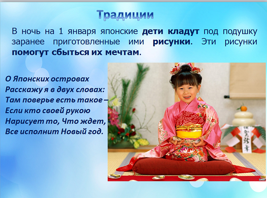 А в Японии приход года возвещают 108 ударов колокола — по поверью, его звон убивает человеческие пороки, а значит, услышавший его, в новом году станет чуточку лучше. Японцы неукоснительно соблюдают основную традицию — чтобы задобрить божество года, которое приносит счастье в семью, устраивают перед домом декоративные композиции-кадомацу с тремя солирующими бамбуковыми ветвями.