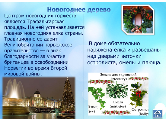 Школьники активно обсуждали и другие обычаи этой удивительной страны. Им было любопытно узнать и о том, что новогодний обычай Великобритании подарил нам традицию преподнесения красивых открыток с добрыми пожеланиями друзьям и близким. Дома здесь, как и в других странах Западной Европы, украшают омелой. Выпускают старый год британцы, открывая задний вход в дом, а впускают новый у парадного.