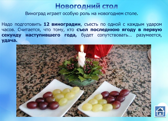 Ребята с интересом слушали рассказ о том, что итальянцы перед Новым годом выкидывают в окна старые вещи – утюги, столы, стулья, чайники, будучи уверенными, что в этом случае их место займут новые вещи. На столе обязательны виноград и чечевица – символы долголетия, плодородия, богатства.