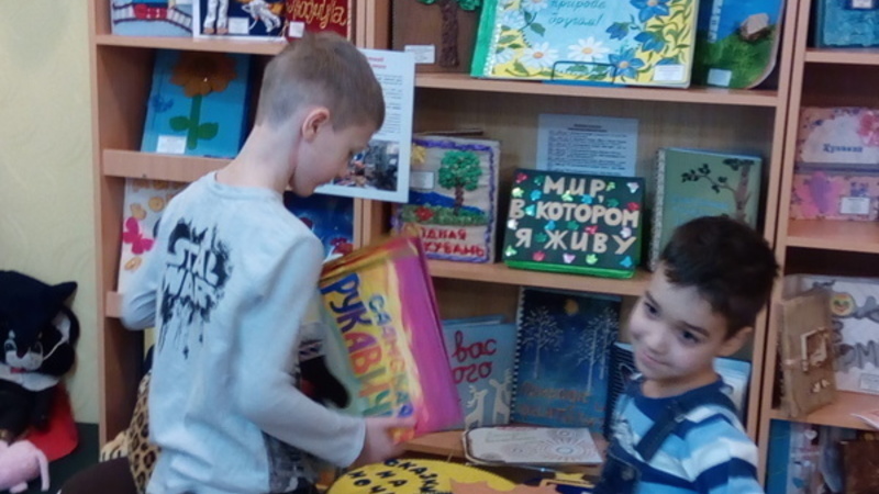 У ребят появилась возможность увидеть и полистать оригинальные по форме книги, сделанные из необычных материалов: фетра, кожи, меха, дерева, бисера, солёного теста. Они прочитали содержание, познакомились с авторскими сказками, интересными историями, литературой по краеведению, экологии, про космос…